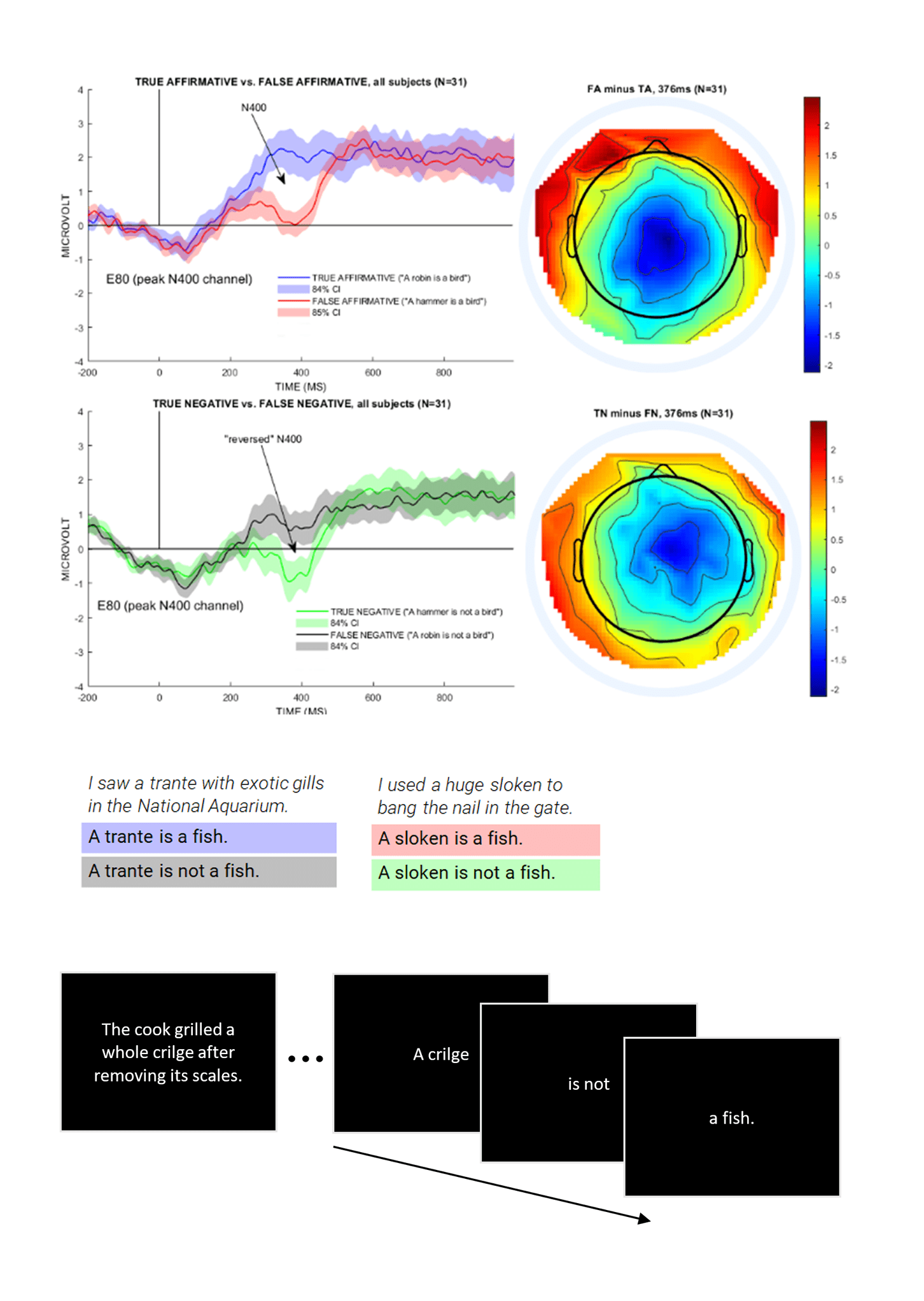 We replicated the design of previous ERP studies on negation, with the addition of pseudowords presented in a fast-mapping rapid word learning context. Participants guessed the meanings of the pseudowords from a context sentence, then read a target sentence containing negation. These target sentences (ex: A crilge is not a plant) are informative, because participants can’t be completely certain of the meanings of these novel words.